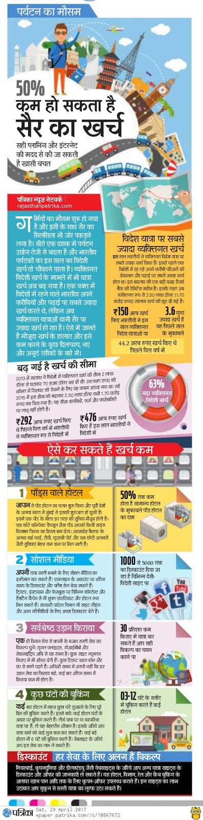 गर्मियों का मौसम शुरू हो गया है और इसी के साथ सैर का सिलसिला भी जोर पकडऩे लगा है। बीते एक दशक में पर्यटन उद्योग तेजी से बदला है और भारतीय पर्यटकों का इस साल का विदेशी खर्च तो चौंकाने वाला है। व्यक्तिगत विदेशी खर्च के मामले में भी यात्रा खर्च अब बढ़ गया है। एक वक्त में भारतीय विदेशों में रहने वाले अपने करीबियों और पढ़ाई पर सबसे ज्यादा खर्च करते थे, लेकिन अब व्यक्तिगत यात्राओं यानी सैर पर ज्यादा खर्च हो रहा है। ऐसे में जानते हैं मौजूदा खर्च के हालात और इसे कम करने के कुछ दिलचस्प, नए और अनूठे तरीकों के बारे में।