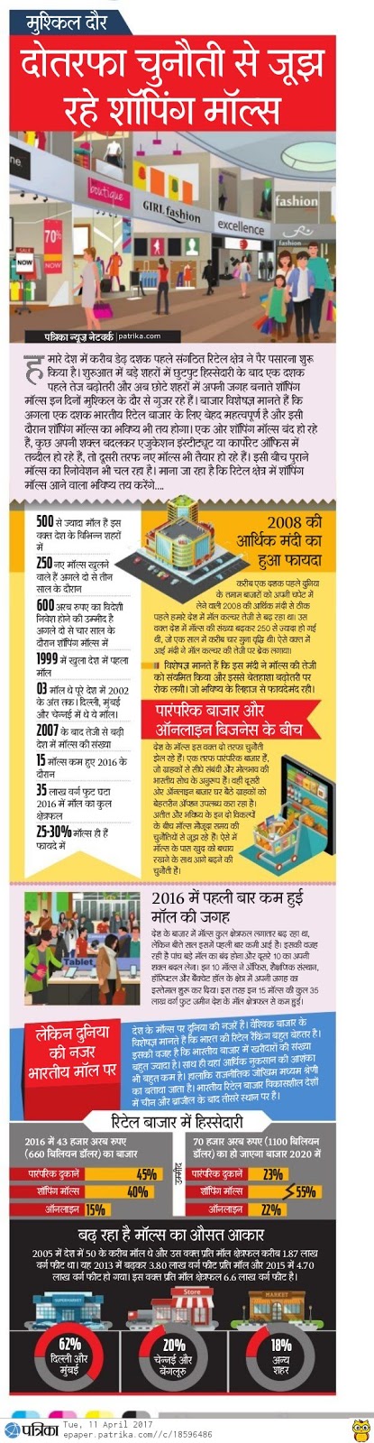 हमारे देश में करीब डेढ़ दशक पहले संगठित रिटेल क्षेत्र ने पैर पसारना शुरू किया है। शुरुआत में बड़े शहरों में छुटपुट हिस्सेदारी के बाद एक दशक पहले तेज बढ़ोत्तरी और अब छोटे शहरों में अपनी जगह बनाते शॉपिंग मॉल्स इन दिनों मुश्किल के दौर से गुजर रहे हैं। बाजार विशेषज्ञ मानते हैं कि अगला एक दशक भारतीय रिटेल बाजार के लिए बेहद महत्वपूर्ण है और इसी दौरान शॉपिंग मॉल्स का भविष्य भी तय होगा। एक ओर शॉपिंग मॉल्स बंद हो रहे हैं, कुछ अपनी शक्ल बदलकर एजुकेशन इंस्टीट्यूट या कार्पोरेट ऑफिस में तब्दील हो रहे हैं, तो दूसरी तरफ नए मॉल्स भी तैयार हो रहे हैं। इसी बीच पुराने मॉल्स का रिनोवेशन भी चल रहा है। माना जा रहा है कि रिटेल क्षेत्र में शॉपिंग मॉल्स आने वाला भविष्य तय करेंगे….