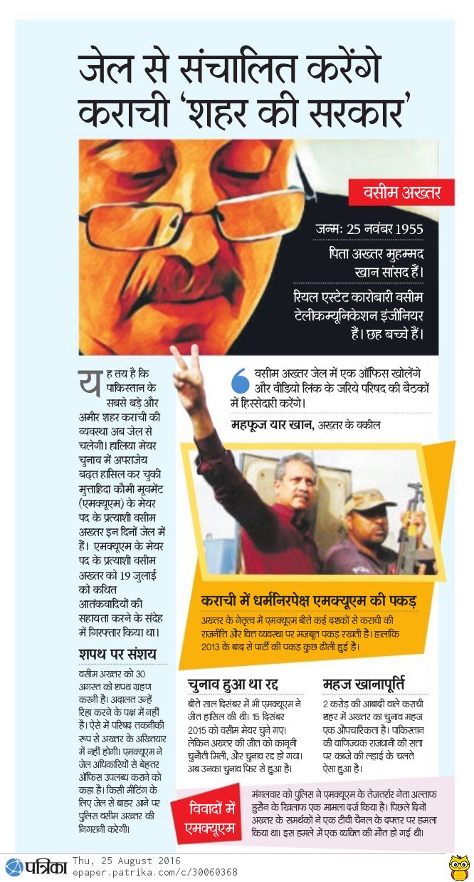 यह पूरी तरह तय हो चुका है कि पाकिस्तान के सबसे बड़े और अमीर शहर कराची की व्यवस्था अब जेल से चलाई जाएगी। हालिया मेयर चुनाव में अपराजेय बढ़त हासिल कर चुकी मुत्ताहिदा कौमी मूवमेंट के मेयर पद के प्रत्याशी वसीम अख्तर इन दिनों जेल में हैं।