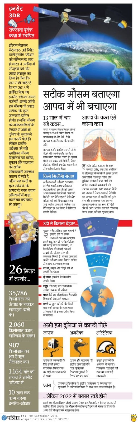इंडियन नेशनल सैटेलाइट- 3डी रिपीट यानी इनसैट 3डीआर की लॉन्चिंग के साथ ही भारत ने अंतरिक्ष में मौजूदगी को और ज्यादा मजबूत कर लिया है। जैसा कि नाम से ही जाहिर है कि यह 2013 में प्रक्षेपित किए गए इनसैट-3डी का उन्नत वर्जन है। इसके जरिये हमें मौसम की ज्यादा सटीक और तुरंत जानकारी हासिल होगी। हालांकि मौसम की भविष्यवाणियों के लिहाज से अभी भी दुनिया के मुकाबले हम काफी पीछे हैं। लेकिन इनसैट-3डीआर की बड़ी खासियत मौसम विज्ञानियों को बारिश, तूफान और चक्रवात की सटीक भविष्यवाणी उपलब्ध कराना नहीं है, बल्कि यह धरती पर कुछ खोजने और आपदा के वक्त बचाव अभियानों में मदद करने का बड़ा काम करेगा।
