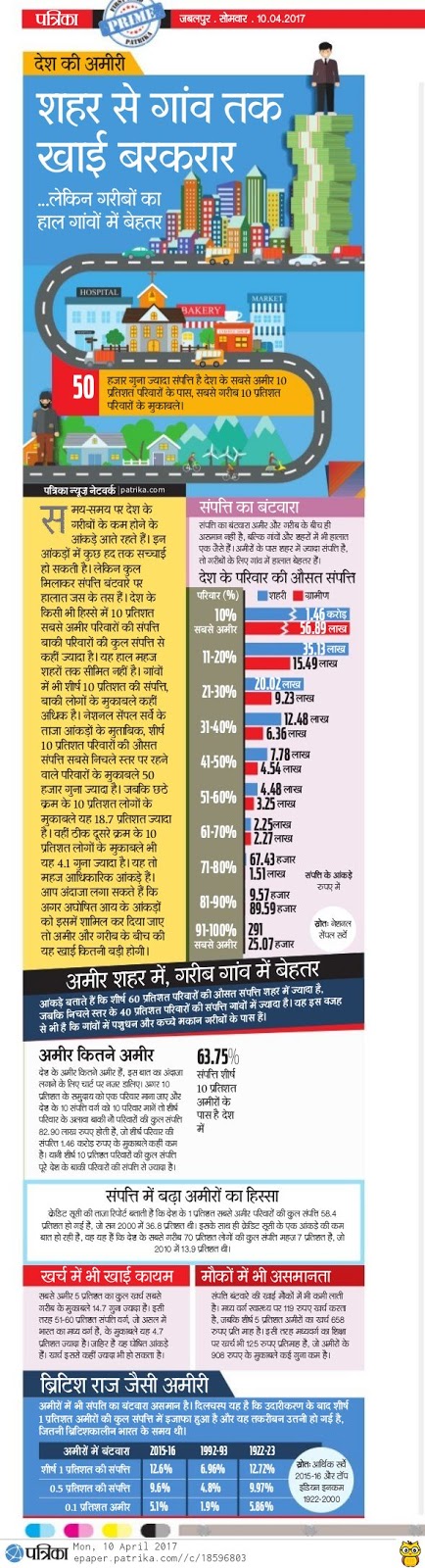 देश के अमीर कितने अमीर हैं, इस बात का अंदाजा लगाने के लिए चार्ट पर नजर डालिये। अगर 10 प्रतिशत के समुदाय को एक परिवार माना जाए और देश के 10 संपत्ति वर्ग को 10 परिवार मानें तो शीर्ष परिवार के अलावा बाकी नौ परिवारों की कुल संपत्ति 82.90 लाख रुपए होती है, जो शीर्ष परिवार की संपत्ति 1.46 करोड़ रुपए के मुकाबले कहीं कम है। यानी शीर्ष 10 प्रतिशत परिवारों की कुल संपत्ति पूरे देश के बाकी परिवारों की संपत्ति से ज्यादा है।