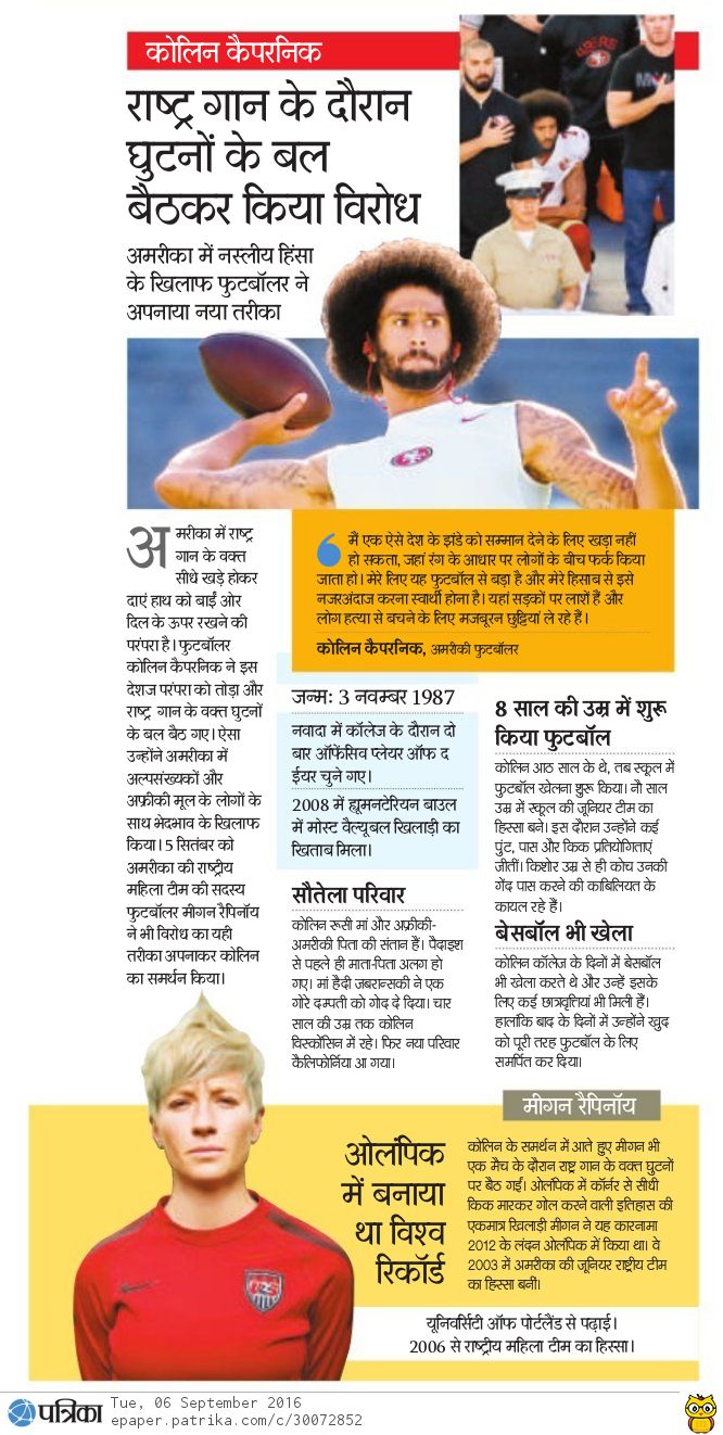 अमरीका में राष्ट्रीय गान के वक्त सीधे खड़े होकर दाएं हाथ को बायीं ओर दिल के ऊपर रखने की परंपरा है। फुटबॉलर कोलिन कैपरनिक हाल ही में अपनी इस देशज परंपरा को तोड़ते हुए राष्ट्रीय गान के वक्त घुटनों के बल बैठ गए। ऐसा उन्होंने अमरीका में अल्पसंख्यकों और अफ्रीकी मूल के लोगों के साथ हो रहे भेदभाव के खिलाफ किया। इससे अमरीका में एक बहस शुरू हो गई। 5 सितंबर को अमरीका की राष्ट्रीय महिला टीम की सदस्य फुटबॉलर मीगन रैपिनॉय ने भी राष्ट्रीय गान के वक्त एक घुटने को जमीन से टिकाकर अपना विरोध दर्ज किया। इससे बहस तीखी हो गई है।