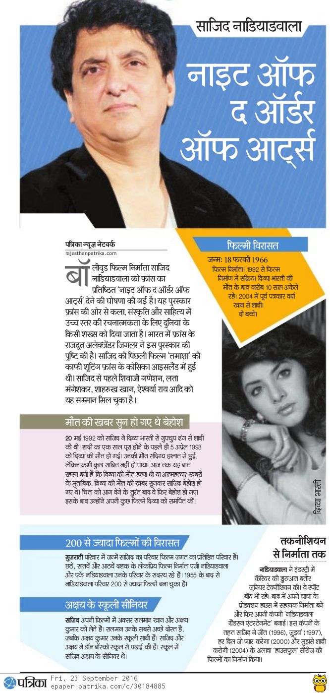बॉलीवुड फिल्म निर्माता साजिद नाडियाडवाला को फ्रांस का प्रतिष्ठित नाइट ऑफ द ऑर्डर ऑफ आट्र्स देने की घोषणा की गई है। यह पुरस्कार फ्रांस की ओर से कला, संस्कृति और साहित्य में उच्च स्तर की रचनात्मकता के लिए दुनिया के किसी शख्स को दिया जाता है। भारत में फ्रांस के राजदूत अलेक्जेंडर जिगलर ने इस पुरस्कार की पुष्टि की है। साजिद की पिछली फिल्म तमाशा की काफी शूटिंग फ्रांस के कोसिका आइसलैंड में हुई थी। साजिद से पहले शिवाजी गणेशन, लता मंगेशकर, शाहरुख खान, ऐश्वर्या राय आदि को यह सम्मान मिल चुका है।