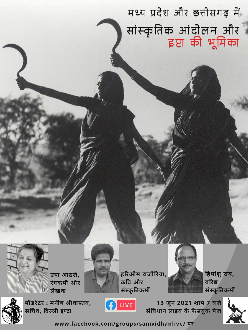 यह ऐतिहासिक पंक्तियां 25 मई 1943 की हैं। इस दिन भारतीय जन नाट्य संघ (इप्टा) की स्थापना के मौके पर अपने अध्यक्षीय वक्तव्य में प्रो. हीरेन मुखर्जी ने ऐसा ही आह्वान किया था। इसके साथ ही मुंबई के मारवाड़ी हाल में इप्टा के रूप में पूरे हिन्दुस्तान में प्रदर्शनकारी कलाओं की परिवर्तनकारी शक्ति को पहचानने की पहली संगठित कोशिश की शुरुआत हुई। ललित कलाएं, काव्य, नाटक, गीत, पारंपरिक नाट्य रूप, इनके कर्ता, राजनेता और बुद्धिजीवी एक जगह इकठ्ठे हुए। इन कलाकारों और संस्कृतिकर्मियों का नारा था- “पीपल्स थियेटर स्टार्स द पीपल” यानी जनता के रंगमंच की नायक जनता स्वयं होती है। मध्य प्रदेश और छत्तीसगढ़ में इप्टा की नाट्य परंपरा की जड़ें बेहद गहरी रही हैं। बीच में सक्रियता कुछ कम हुई और 1985 के आसपास फिर एक बार एकजुट हुए और बेहतर काम शुरू हुआ। आज जब संस्कृतिकर्म और संस्कृतिकर्मियों पर लगातार हमले किए जा रहे हैं और कलाओं को सरकारी चाकरी का औजार बनाया जा रहा है, ऐसे वक्त में इप्टा की विरासत को जानना, समझना और इस पर बातचीत करना जरूरी लगता है। इसी कड़ी में संविधान लाइव ने 13 जून 2021 को शाम ‘मध्य प्रदेश और छत्तीसगढ़ में सांस्कृतिक आंदोलन और इप्टा की भूमिका’ विषय पर फेसबुक पेज पर लाइव बातचीत की।