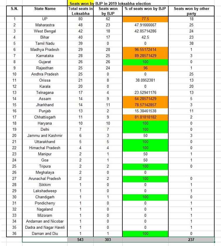 पहली कैटगरी में वे राज्य या केंद्र शासित प्रदेश रखते हैं, जहां भाजपा ने एक भी सीट नहीं जीती। ऐसे 11 राज्यों में कुल 93 सीटें हैं। इनमें से केरल, आंध्र प्रदेश और तमिलनाडु में कुल 84 सीट हैं और भाजपा का यहां खाता भी नहीं खुला था।