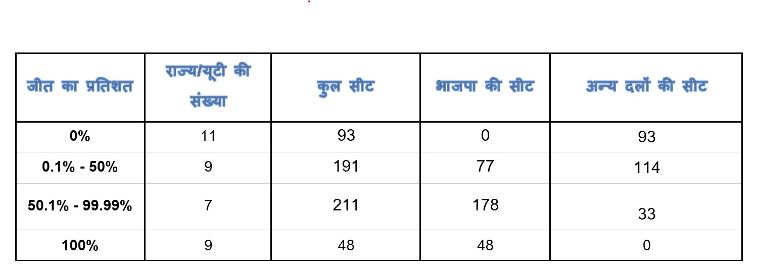 तीसरी कैटेगरी में वे क्षेत्र हैं, जहां भाजपा ने 50 प्रतिशत से अधिक लेकर 100 प्रतिशत से कम सीट जीतीं। ऐसे 7 राज्यों में 211 सीट हैं और इनमें से भाजपा ने 178 सीट जीती हैं।