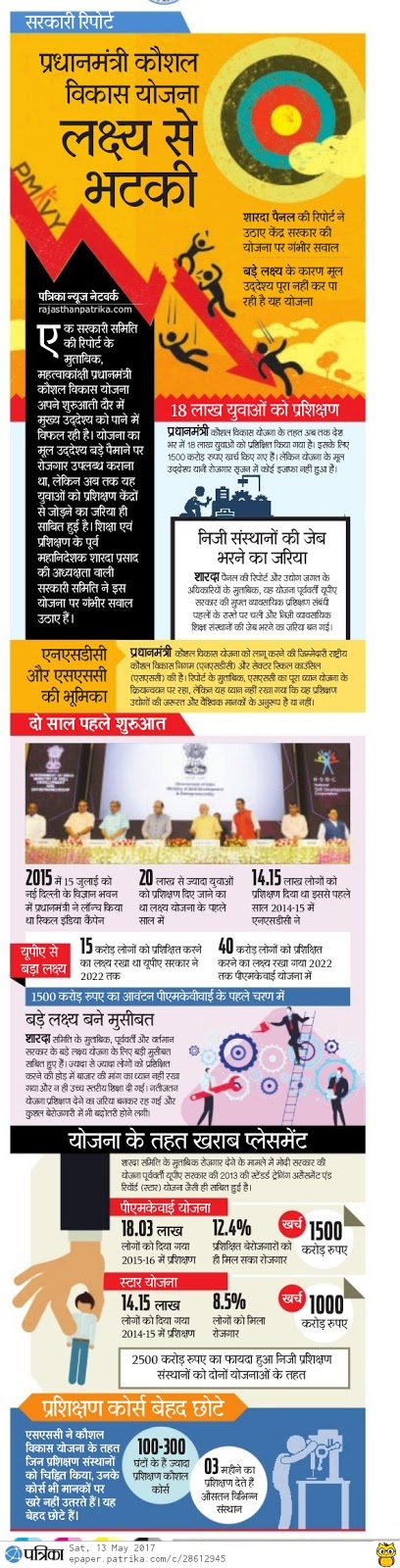 एक सरकारी समिति की रिपोर्ट के मुताबिक, केंद्र सरकार की महत्वाकांक्षी प्रधानमंत्री कौशल विकास योजना अपने शुरुआती दौर में मुख्य उद्देश्य को पाने में असफल रही है। योजना का मूल उद्देश्य बड़े पैमाने पर रोजगार उपलब्ध कराना था, लेकिन अब तक यह युवाओं को प्रशिक्षण केंद्रों से जोडऩे का जरिया ही साबित हुई है। शिक्षा एवं प्रशिक्षण के पूर्व महानिदेशक शारदा प्रसाद की अध्यक्षता वाली सरकारी समिति ने इस योजना पर गंभीर सवाल उठाए हैं।
